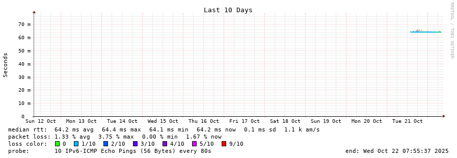 9 > 2001:4350:1:f010::2 (2001:4350:1:f010::2) [AS5438] 64.148ms 64.033ms 64.254ms